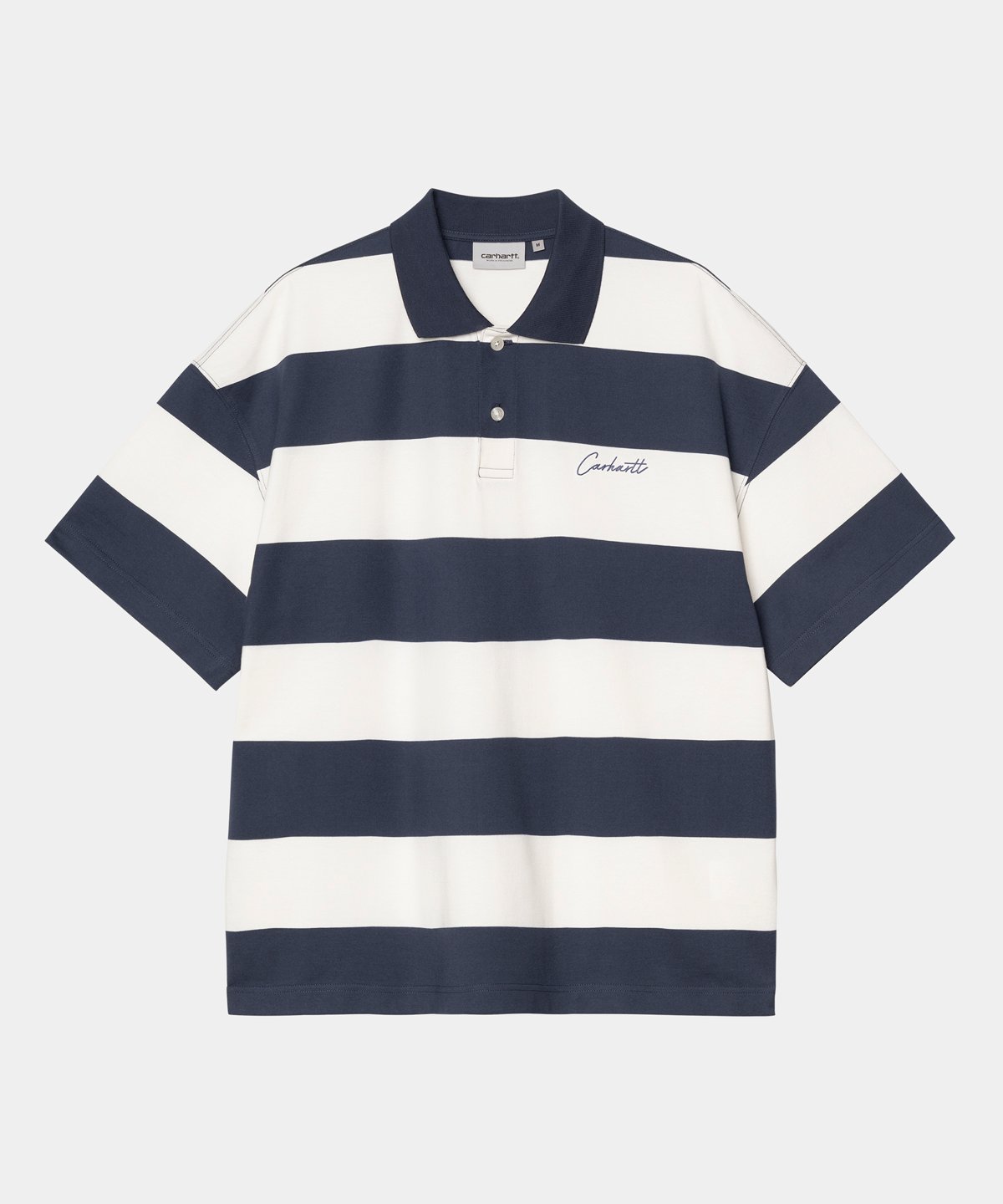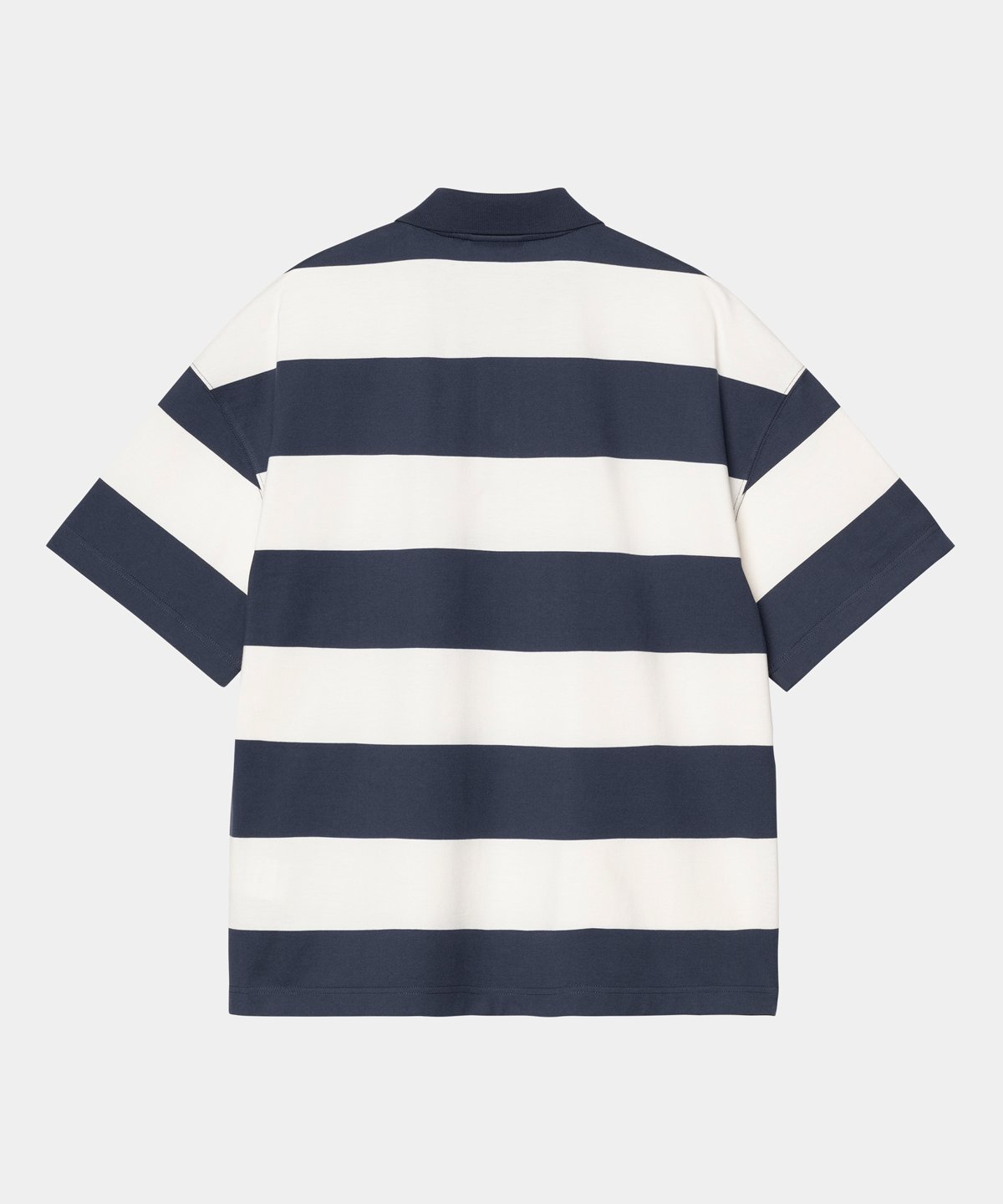 The S/S Delray Polo is made in a boxy loose fit from a midweight organic cotton jersey featuring allover stripes. The item has a collar and a buttoned half-placket. Graphic embroidery appears on the chest.
